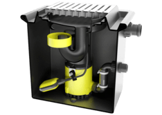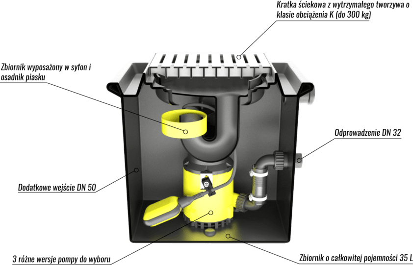 Przepompownia do wody brudnej, z kratką ściekową do montażu w podłodze. Idealnie sprawdzi się w łazienkach oraz wszelkiego rodzaju pomieszczeniach sanitarnych i technicznych z których trzeba odprowadzić brudną wodę z kratki podłogowej, pralki, umywalki czy brodzika prysznicowego.